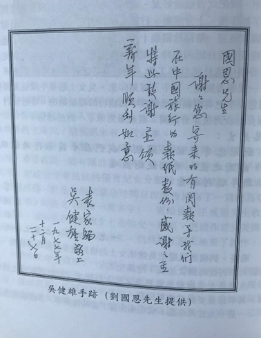 拙作《吳健雄二三事》一文後來收進我的專著《名人往事漫憶》一書中,我把此書送給好友、香港中旅汽車有限公司劉國恩副總經理,他看了拙作後,十分感動,打電話來告訴我,一九七七年吳健雄伉儷受國家邀請,離開故國幾十年後第一次回中國大陸訪問,他們由美國途經香港往返內地時,剛好由劉國恩先生負責接送,劉先生那時在香港中旅社接待部工作,他還清楚記得這兩位長者慈祥、和藹、一派學者風範,留下了深刻印象。吳女士遊畢中國返美國後,劉國恩先生把有關報道他們在中國旅行的報紙數份,寄送他們,吳健雄女士收到後非常高興,並親筆寫來了一封感謝信。
